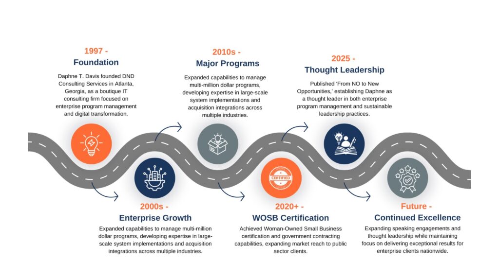 Daphne T. Davis founded DND Consulting Services, Inc. as a Woman-Owned Small Business dedicated to excellence in enterprise program management and digital transformation. Based in Atlanta with national reach, DND specializes in helping organizations overcome complex business and technology challenges with agility, precision, and measurable outcomes.